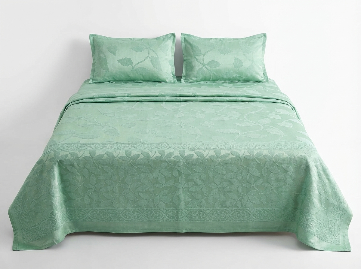 Transform your bedroom into a serene sanctuary with this exquisite Mint Green Jacquard Double Bedsheet. Expertly woven to create a lustrous self-pattern, the fabric features graceful trailing leaf vines that catch the light, adding a touch of understated luxury to your decor. The highlight of this bedding set is its heavy jacquard border design, which showcases a dense, intricate botanical motif, providing a rich texture and a sophisticated frame to your bed.
